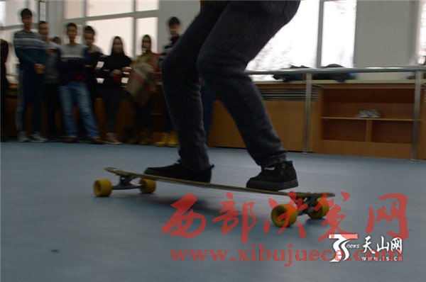 11月20日,烏魯木齊的氣溫低至零下十五度,天空中還飄著雪花。新疆農(nóng)業(yè)大學(xué)禮堂內(nèi)卻暖意融融,不時(shí)傳來掌聲與喝彩聲。只見一名男生飛快地上板、蹬腳、滑行、起跳、轉(zhuǎn)彎、落地……短短幾十秒內(nèi),完成了一整套平地自由花式動(dòng)作。待他走下場(chǎng)地,周圍的學(xué)生紛紛迎上去,一一和他擊掌表示祝賀和鼓勵(lì)。