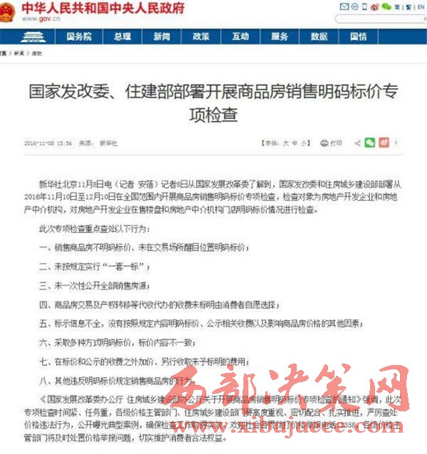 近日,國家發(fā)改委及住建部聯(lián)合發(fā)布了對商品房“明碼標價”的新一輪整治措施。部署從2016年11月10日至12月10日在全國范圍內(nèi)開展商品房銷售明碼標價專項檢查。此次專項檢查重點查處以下八類行為。“明碼標價”、“一套一標”、“醒目”、“自愿”、“一致”成為重點關(guān)鍵詞。