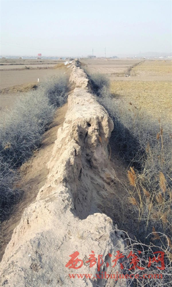 省政府立的明長城景泰段全國重點文物保護碑。 本文圖均為 甘肅日報 圖春節(jié)期間,記者來到這段明長城后看到,這段由黃土夯筑而成的長城,在歷經(jīng)400多年的風(fēng)雨侵蝕和人為破壞后,已成為斷斷續(xù)續(xù)、高低不一的“土壟子”。即便間或殘存有一大段連續(xù)的城墻,也被兩側(cè)的農(nóng)田“啃噬”得只剩下一兩米高寬。