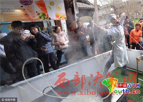 "我當(dāng)時就想著搞點花樣,來招攬客人。"田波告訴記者,一開始他只是簡單地扭幾個動作,把原來扯面的動作,變得更花哨。