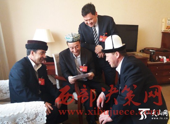 全國人大代表那布拉夏·胡加洪(左一)正在與全國人大代表麥麥提熱伊木·買買提明(左二)、牙生·吐爾遜(左三)、蘇力坦·加依那克(右一)交流。