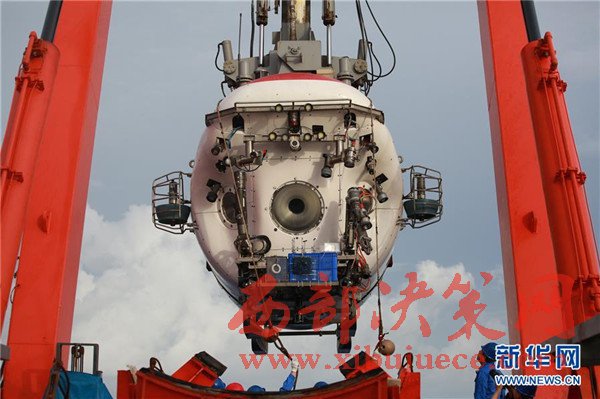 5月23日,“蛟龍”號(hào)完成下潛后回收到“向陽紅09”科學(xué)考察船上。
