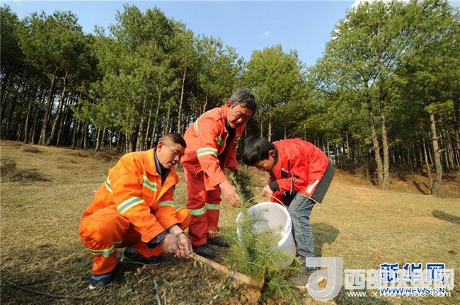 3月10日,沙子坡林場(chǎng)的護(hù)林員與他們的孩子在林區(qū)補(bǔ)植樹(shù)苗。