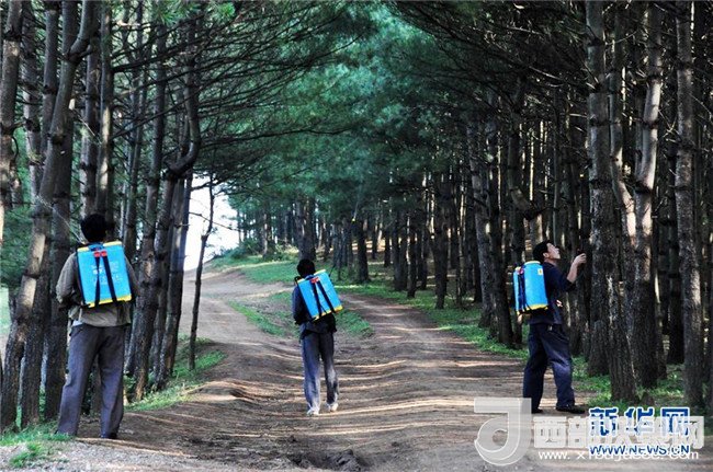 沙子坡林場(chǎng)的護(hù)林員在林區(qū)內(nèi)噴灑藥劑防治病蟲(chóng)害(2013年7月8日攝)。