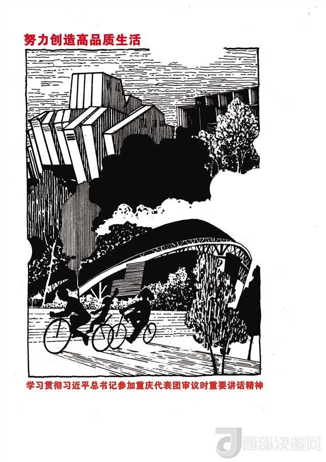 另一組負(fù)責(zé)“創(chuàng)造高品質(zhì)生活”的師生也遭遇類似的問(wèn)題。最初師生們想用一組市民在公園鍛煉的場(chǎng)景來(lái)闡述這個(gè)主題,但很快就發(fā)現(xiàn)這樣的畫面太簡(jiǎn)單蒼白。最終,他們將重慶大劇院、重慶美術(shù)館、奧體中心等重慶的標(biāo)志性建筑作為文化符號(hào)列入畫稿中,才有了令人耳目一新的感覺。