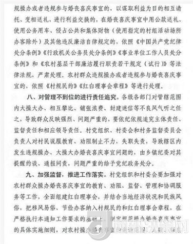 各級各部門對管轄范圍內(nèi)大操大辦、相互攀比、鋪張浪費、封建迷信等不良風(fēng)氣聽之任之,導(dǎo)致群眾反映強烈、問題嚴重的,要依紀依規(guī)追究主體責(zé)任、監(jiān)督責(zé)任和相應(yīng)領(lǐng)導(dǎo)責(zé)任。村黨組織、村委會和村務(wù)監(jiān)督委員會負責(zé)人對村民說服教育、勸阻制止不力,失職失責(zé),導(dǎo)致轄區(qū)內(nèi)發(fā)生違規(guī)操辦、大操大辦婚喪喜慶事宜問題的,由鄉(xiāng)鎮(zhèn)紀委對其提醒約談、通報問責(zé),問題嚴重的給予黨紀政務(wù)處分。