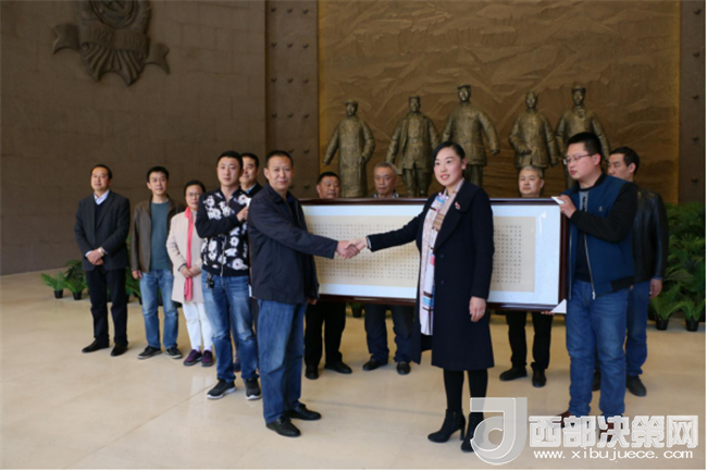 西部決策網(wǎng)——西部大開發(fā)訊(帥華鋒 通訊員 柴金霞 陳彥榮)“三月的南梁,大地處處蕩漾著春的漣漪.....”在這生機(jī)勃勃、春意盎然的美好時(shí)節(jié),中國(guó)書法家協(xié)會(huì)會(huì)員、首屆《世界華人運(yùn)動(dòng)大會(huì)書畫展》楷書評(píng)委、清心齋主人趙倉(cāng)老師一行,帶著對(duì)革命老區(qū)的深情厚誼和對(duì)劉志丹、謝子長(zhǎng)、習(xí)仲勛等革命先輩舍生忘死、救民出水火的崇敬之意來到革命圣地——南梁,向紀(jì)念館捐贈(zèng)書法作品《長(zhǎng)恨歌·習(xí)仲勛》。本作品系趙倉(cāng)老師艱辛創(chuàng)作的佳品力作,飽含了趙倉(cāng)老師豐厚的文化內(nèi)涵,真實(shí)再現(xiàn)了習(xí)仲勛老人不畏艱難、矢志堅(jiān)守的人生壯麗詩(shī)篇。