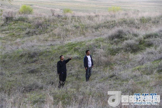 新疆霍城四爪陸龜國家級自然保護區(qū)管理局工作人員林世忠(左)和護林員伊力扎提·伊麻木在保護區(qū)內巡查(4月15日攝)。