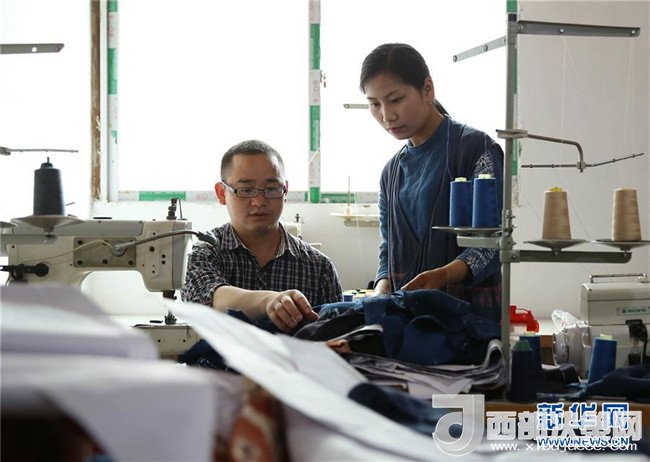5月2日,在貴州省丹寨縣,張義蘋(píng)(右)與同事討論蠟染服裝樣式。