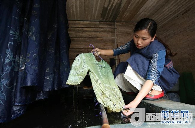 5月2日,在貴州省丹寨縣,張義蘋(píng)在染房?jī)?nèi)查看蠟染產(chǎn)品的染色效果。