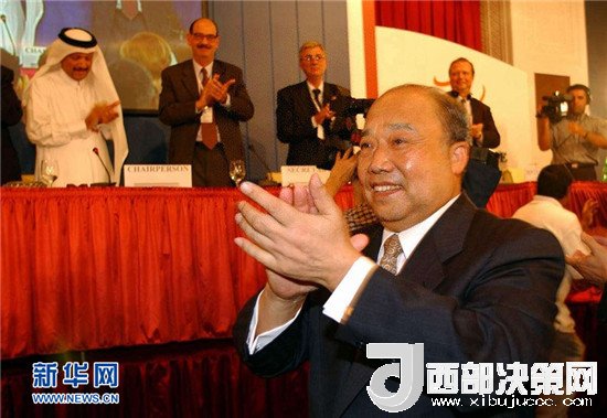 2001年11月10日,世界貿(mào)易組織第四屆部長(zhǎng)級(jí)會(huì)議在卡塔爾首都多哈以全體協(xié)商一致的方式,審議并通過(guò)了中國(guó)加入世貿(mào)組織的決定。這是決定通過(guò)后,時(shí)任中國(guó)政府代表團(tuán)團(tuán)長(zhǎng)、外經(jīng)貿(mào)部部長(zhǎng)石廣生與其他與會(huì)者鼓掌慶賀。新華社記者 王建華 攝