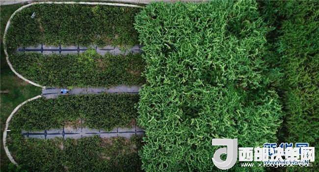 工作人員在蘇州市吳中區(qū)金庭鎮(zhèn)馬家門(mén)前治污生態(tài)濕地查看垂直流濾床的運(yùn)行狀況(7月4日無(wú)人機(jī)拍攝)。