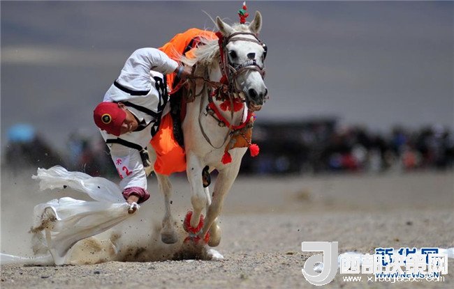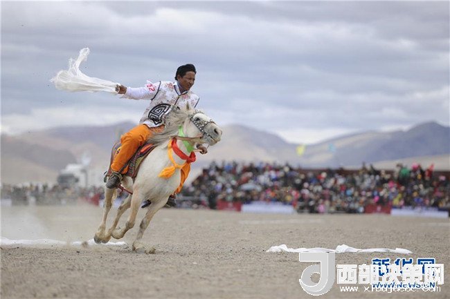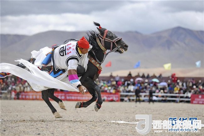 當(dāng)日,西藏阿里地區(qū)在獅泉河鎮(zhèn)舉行賽馬競技大賽,比賽項目有騎馬拾哈達、撿茶磚、騎馬射箭、馬術(shù)表演等,共有150名農(nóng)牧民選手參加比賽,吸引了2萬余名觀眾前來觀看。新華社記者張汝鋒攝