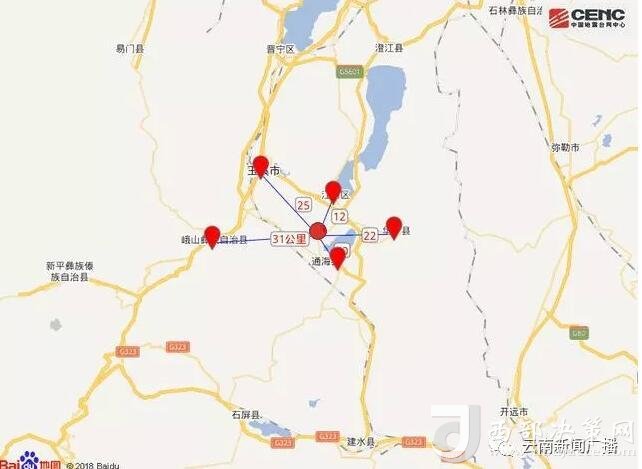 震中距通??h10公里、距江川區(qū)12公里、距華寧縣22公里、距紅塔區(qū)25公里、距峨山彝族自治縣31公里,距玉溪市24公里,距昆明市95公里。