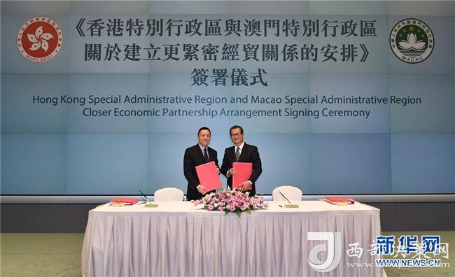 香港特區(qū)政府財政司司長陳茂波(右)和澳門特區(qū)政府經(jīng)濟(jì)財政司司長梁維特在香港簽署《香港特別行政區(qū)與澳門特別行政區(qū)關(guān)于建立更緊密經(jīng)貿(mào)關(guān)系的安排》(2017年10月27日攝)。新華社記者呂小煒攝