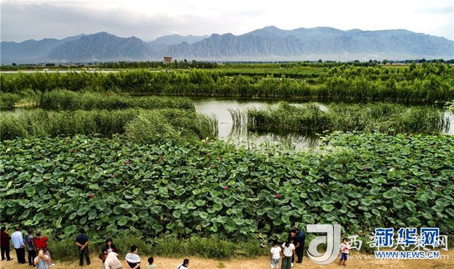 8月22日,游人在廣靈縣壺流河濕地觀賞盛開的荷花(無(wú)人機(jī)拍攝)。新華社記者 陶明 攝