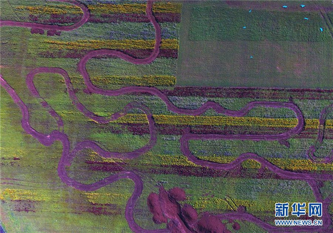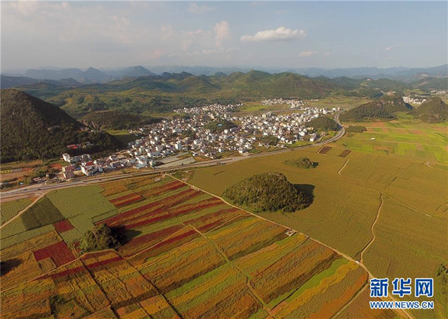 云南羅平的七彩花田(9月5日無人機拍攝)。 新華社記者楊宗友攝