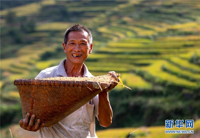 9月19日,花田鄉(xiāng)何家?guī)r村村民冉紅兵端著裝滿(mǎn)稻谷的簸箕。
