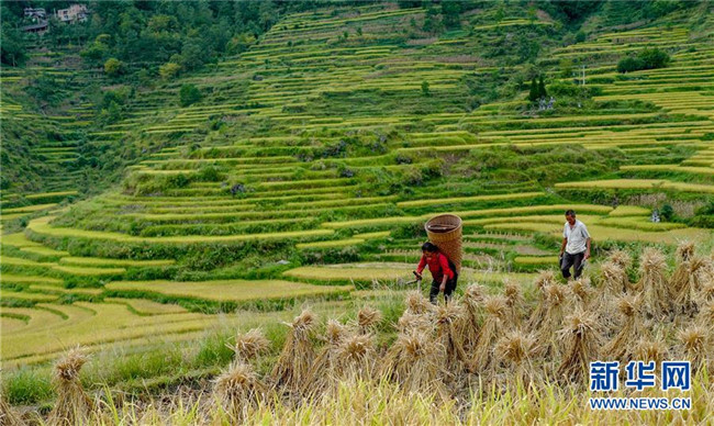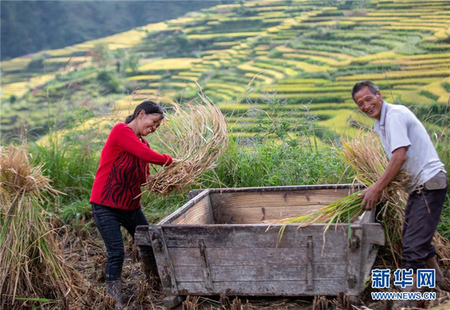 9月19日,花田鄉(xiāng)何家?guī)r村村民冉紅兵(右)齊書(shū)仙夫婦收獲稻米后回家。記者劉潺攝