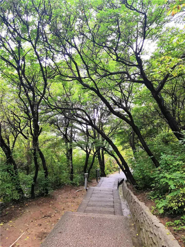 清晨,陽(yáng)光穿過(guò)樹林灑在石階上,斑駁的光影隨風(fēng)自在地?fù)u晃。茂密的樹林蒸騰起無(wú)數(shù)看不見的水汽,溫潤(rùn)的撲在臉上,令人心曠神怡。