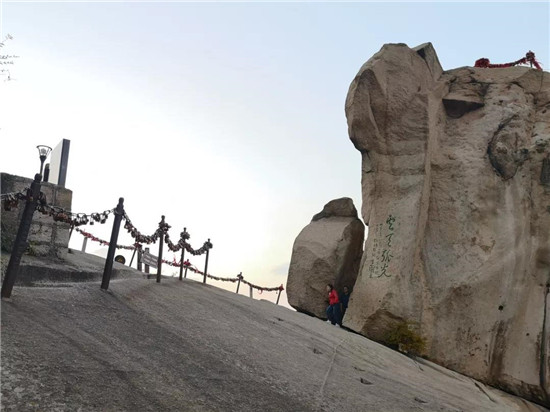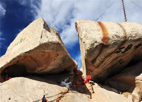 華山以石著名,每一處奇石都有一個美麗而動人的傳說。過了擦耳崖,看到的這兩塊石頭叫“日月巖”,左邊的代表“日”,右邊的代表“月”,上面這四個字是“云天弧光”,有時在夜晚,這里會出現(xiàn)一道非常耀眼的光。相傳武則天當年上華山走這里,看到這兩塊形似日月的石頭,就別出心栽地給自個兒的字號創(chuàng)造了一個“瞾”字,因為這兩塊奇石上頂青天,下臨空谷,唯我獨尊,是光明與權(quán)威的象征。