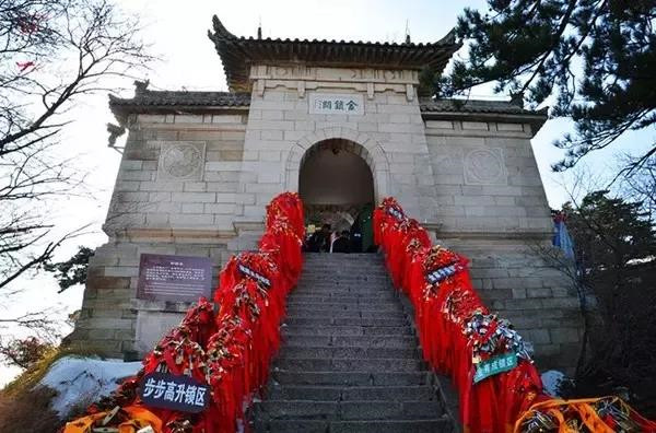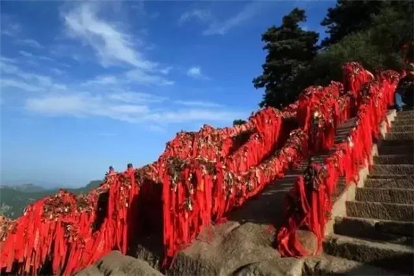 到達金鎖關時,一番令人動容的風景——金鎖關關內、關外登山路兩側的鐵索上,情侶鎖重重疊疊,紅繩彩線迎風搖曳,筑成一道美麗的愛情心愿風景線。 眼前大片大片的紅色,令游人的視覺和心靈受到強烈的沖擊。這是沿路兩邊鐵鏈上綁滿的密密麻麻的紅色絲繩,不留一絲空隙,風吹來,長長的紅色絲繩就輕盈的舞起來,如愛情牢固的臂膀,甜蜜的飛翔在華山之上。