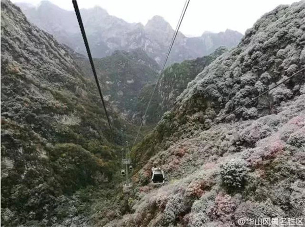當(dāng)滿山的紅葉還依舊掛在樹枝,露出嬌羞的笑臉時(shí),秋末的華山,已經(jīng)下起了今年的第一場雪。放眼望去,整座山體好像被薄薄的彩衣包裹,若隱若現(xiàn)。