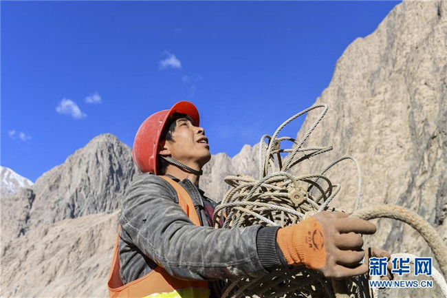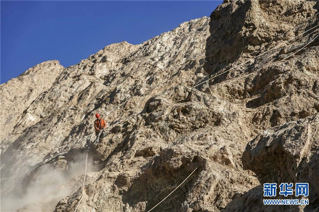 11月12日,在新疆塔什庫爾干塔吉克自治縣大同鄉(xiāng)鄉(xiāng)政府附近的一處路段,工人背著施工設(shè)備在峭壁上攀爬。 近日,一支由四川、云南等地工人組成的施工隊忙碌在帕米爾高原深處的大山中,為塔什庫爾干塔吉克自治縣縣城至大同鄉(xiāng)道路的易落石路段安裝防護網(wǎng)。崇山峻嶺間,工人要攀爬至峭壁上施工作業(yè),如躍動在大山間的“舞者”。據(jù)介紹,這支施工隊常年活躍在新疆山區(qū)道路的施工現(xiàn)場,為風(fēng)險路段加裝安全防護裝置,保障過往車輛和沿途村民出行安全。 新華社記者 胡虎虎 攝