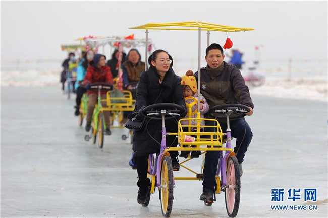 游客在南疆巴音郭楞蒙古自治州境內(nèi)的博斯騰湖冰面上騎自行車(2月6日攝)。各地張燈結(jié)彩,處處歡聲笑語(yǔ),地處中國(guó)西北邊陲的新疆各族群眾,新春佳節(jié)期間,耍社火、逛廟會(huì)、看演出、玩冰雪,載歌載舞,在濃濃的中華傳統(tǒng)文化氛圍中熱熱鬧鬧過大年。新華社發(fā)(年磊攝)