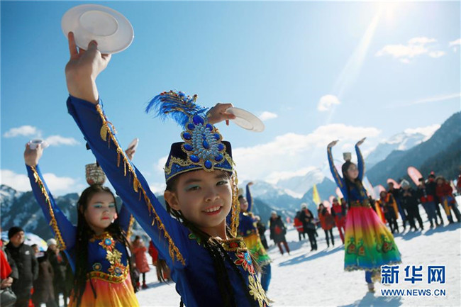 在天山天池景區(qū),小朋友在社火表演中跳舞(2月8日攝)。各地張燈結(jié)彩,處處歡聲笑語(yǔ),地處中國(guó)西北邊陲的新疆各族群眾,新春佳節(jié)期間,耍社火、逛廟會(huì)、看演出、玩冰雪,載歌載舞,在濃濃的中華傳統(tǒng)文化氛圍中熱熱鬧鬧過大年。新華社發(fā)(周勇強(qiáng)攝)
