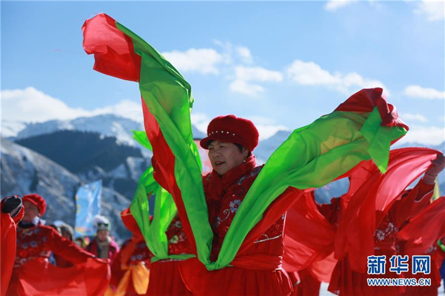 在天山天池景區(qū),老人在社火表演中跳秧歌舞(2月8日攝)。各地張燈結(jié)彩,處處歡聲笑語(yǔ),地處中國(guó)西北邊陲的新疆各族群眾,新春佳節(jié)期間,耍社火、逛廟會(huì)、看演出、玩冰雪,載歌載舞,在濃濃的中華傳統(tǒng)文化氛圍中熱熱鬧鬧過大年。新華社發(fā)(周勇強(qiáng)攝)