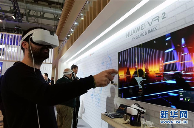 2月28日,在西班牙巴塞羅那,一名男子在世界移動通信大會上的華為展區(qū)體驗虛擬現(xiàn)實(VR)游戲。 新華社記者郭求達攝