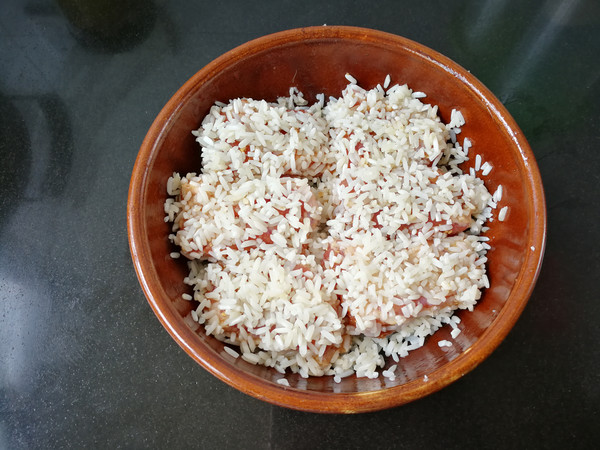 4.把泡透的糯米先放一層在盤(pán)底,再放上腌過(guò)的排骨,把余下的糯米撒在上面