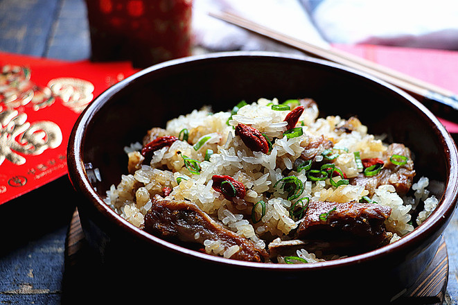 7.蒸好的排骨糯米飯取出淋點(diǎn)醬油、撒下蔥花,再用筷子打松排骨與飯粒,即可食用