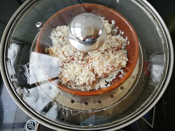 6.大火燒開(kāi)水,把排骨糯米蒸一小時(shí)左右,再撒入枸杞子,再燜蒸30分鐘