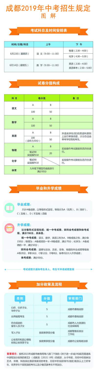 今年中考考試時(shí)間與往年一樣,為6月13日、14日,考試科目和計(jì)分辦法均未作調(diào)整。也即是說(shuō),今年中考統(tǒng)一考試科目依然為語(yǔ)文、數(shù)學(xué)、英語(yǔ)、物理、化學(xué)、體育六科。其中,物理、化學(xué)包括實(shí)驗(yàn)操作考試。體育考試以及物理、化學(xué)實(shí)驗(yàn)操作考試在九年級(jí)下期4月底以前,由各區(qū)(市)縣組織進(jìn)行。九年級(jí)結(jié)束時(shí),語(yǔ)、數(shù)、英、物、化五科的畢業(yè)考試與升學(xué)考試一并進(jìn)行,各科筆試考試均為閉卷考試,具體時(shí)間安排詳見(jiàn)圖解。其中,外語(yǔ)類(lèi)學(xué)校(班),如成外實(shí)外等校的英語(yǔ)科,原則上單獨(dú)命題,統(tǒng)一考試。