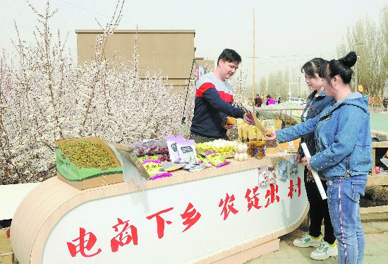 3月23日,新疆托克遜縣夏鄉(xiāng)南湖村電子商務(wù)服務(wù)點(diǎn)的工作人員在為游客介紹當(dāng)?shù)氐奶厣r(nóng)產(chǎn)品。 近年來,托克遜縣通過構(gòu)建電子商務(wù)培訓(xùn)體系、農(nóng)產(chǎn)品營(yíng)銷體系等,幫助當(dāng)?shù)剞r(nóng)民開設(shè)網(wǎng)店,尋找代銷產(chǎn)品、入駐網(wǎng)絡(luò)銷售平臺(tái),引領(lǐng)農(nóng)民走上致富路。(秦梅花)