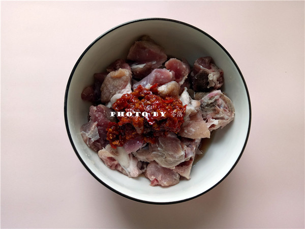 2.豬肉里調入料酒、醬油、鹽、糖、鮮椒醬、蠔油;
