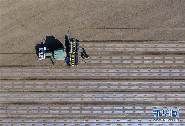 在新疆生產(chǎn)建設(shè)兵團第六師共青團農(nóng)場的棉花地中,一名農(nóng)場職工在一輛裝有北斗導(dǎo)航系統(tǒng)的多功能一體化無人駕駛精量播種機后檢查地膜鋪設(shè)情況(4月19日攝)。