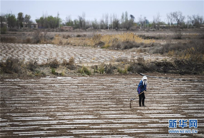 在新疆生產(chǎn)建設(shè)兵團第六師共青團農(nóng)場的棉花地中,一名農(nóng)場職工在無人駕駛精量播種機播種之后的棉田上,檢查地膜表面壓土情況(4月22日攝)。