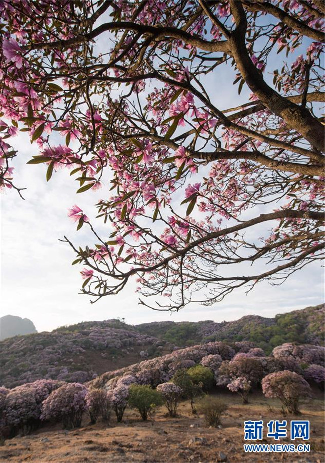 4月24日拍攝的龍頭山的野生杜鵑花。 近日,四川省攀枝花市鹽邊縣龍頭山十余萬畝野生杜鵑花盛開,吸引省內(nèi)外游客前來登山賞花。 龍頭山位于四川省攀枝花市鹽邊縣北部的紅寶苗族彝族鄉(xiāng)境內(nèi),這里的野生杜鵑花花期為2月至5月。 新華社記者 江宏景 攝