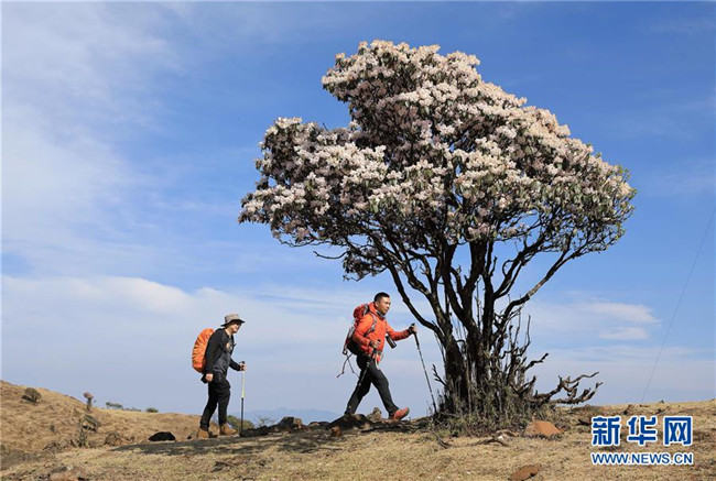 4月23日,戶外愛好者經(jīng)過龍頭山野生杜鵑花。 近日,四川省攀枝花市鹽邊縣龍頭山十余萬畝野生杜鵑花盛開,吸引省內(nèi)外游客前來登山賞花。 龍頭山位于四川省攀枝花市鹽邊縣北部的紅寶苗族彝族鄉(xiāng)境內(nèi),這里的野生杜鵑花花期為2月至5月。 新華社記者 江宏景 攝