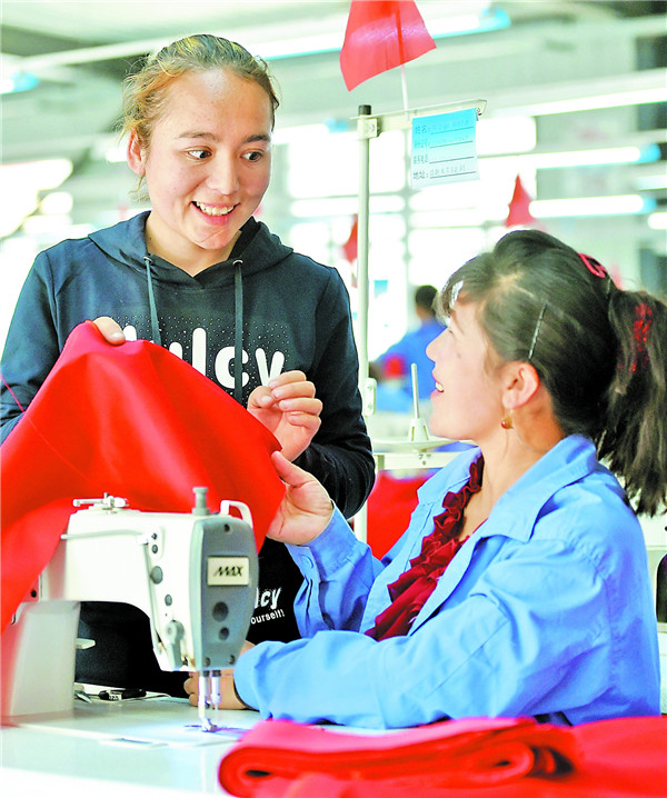 4月19日,亞爾買里村村民阿瓦汗·艾尼瓦爾(左)在車間與工人交流。如今,她已成長為村辦工廠的廠長助理。周鵬 攝