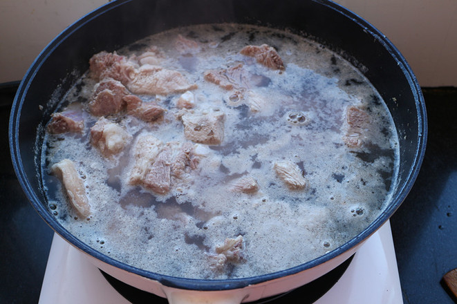 2.首先排骨焯水,排骨冷水下鍋,煮開鍋后兩分鐘,去除血水浮末