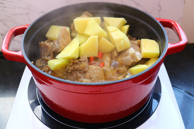 8.20分鐘后加入切好的土豆塊,小辣椒繼續(xù)燉15分鐘
