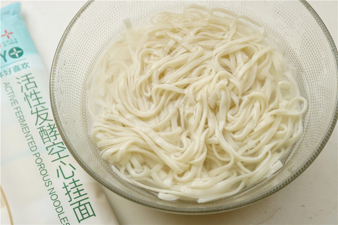 1.準(zhǔn)備好食材。金龍魚(yú)新品活性發(fā)酵空心掛面,做拌面口感也超好。
