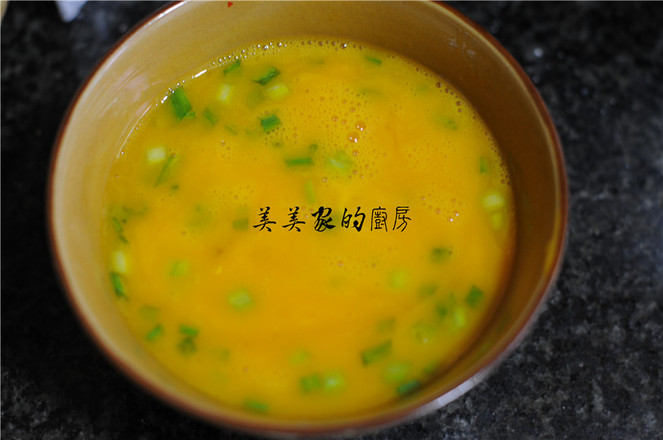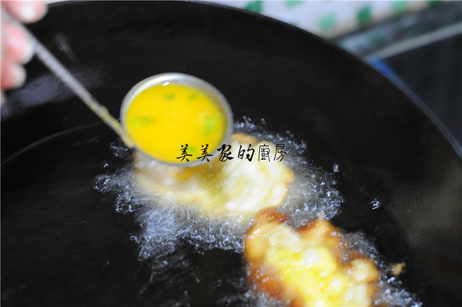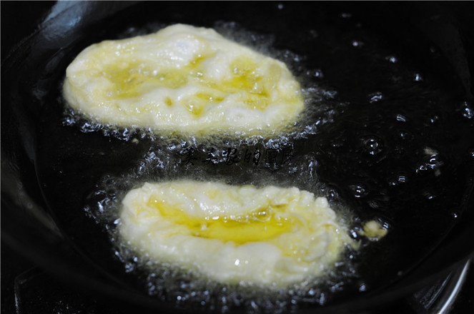 7.面團(tuán)底部微微焦黃,凹洞里面微微炸熟后,舀起一勺蛋液倒入凹洞中,不停地往蛋液上澆油,炸制熟透后出鍋瀝干油即可。