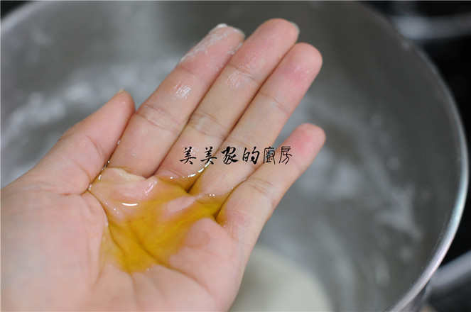 6.揪起一小團(tuán)面團(tuán),稍微拉扯成扁圓形,放入燒至5成熱的油鍋中,迅速用筷子將面團(tuán)往兩邊拉,扯成橢圓形、中間留出深深的凹洞。