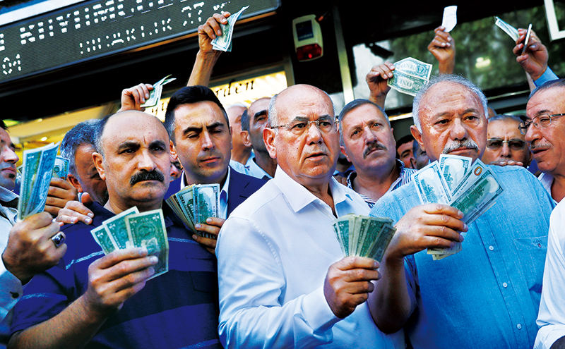 2018年,由于美聯(lián)儲(chǔ)加息導(dǎo)致國(guó)際游資大規(guī)?;亓?,美國(guó)對(duì)土耳其、伊朗進(jìn)行制裁以及貿(mào)易保護(hù)主義的影響,俄羅斯、阿根廷、土耳其、南非等不少經(jīng)濟(jì)體貨幣遭遇大幅貶值。圖為2018年8月14日,在土耳其首都安卡拉,人們響應(yīng)政府號(hào)召,手持美元站在貨幣兌換處前,出售手中的美元支持本國(guó)貨幣里拉。 新華社/路透