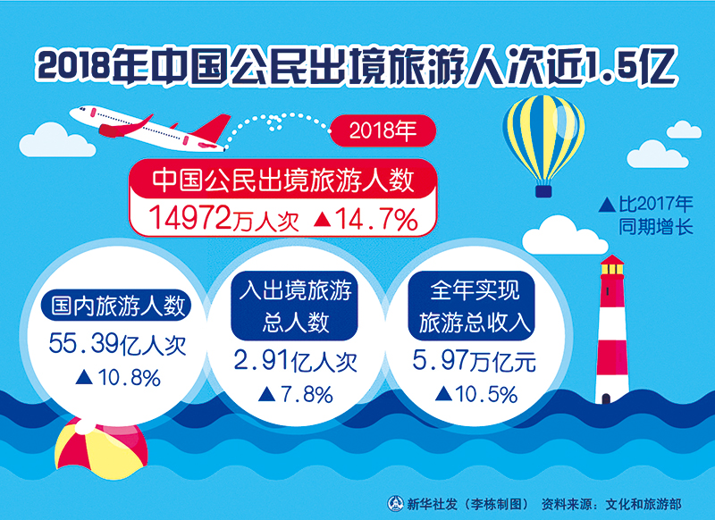近年來(lái),隨著我國(guó)經(jīng)濟(jì)社會(huì)發(fā)展,人民生活水平得到顯著提高,國(guó)民旅游休閑生活更加精彩,出境旅游成為新的時(shí)尚。圖為2018年中國(guó)公民出境旅游相關(guān)數(shù)據(jù)。 新華社發(fā) 李棟/制圖